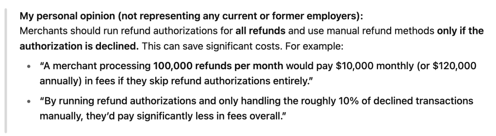 | Customers | Without refund authorization, customers often had no visibility into the status of a refund after the merchant agreed to process it. If a card was closed due to loss or fraud, customers had to rely on the issuer’s best efforts to receive their money. Even if the merchant offered to issue a check, there was no guarantee, leaving customers confused or even financially stranded if they had severed their relationship with the bank. | With refund authorization, as soon as the merchant runs the refund authorization, the customer can see a pending credit on their card. If the transaction is declined, merchant customer service teams can assist the customer by offering alternative options like a check or refund to another card. |
