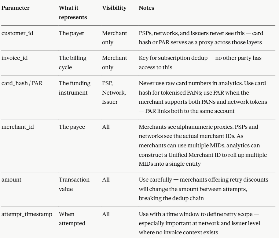 The PAN vs network token problem. Some merchants retry declined transactions using a network token where the original attempt used a raw PAN, or vice versa. This breaks the uniqueness of card_hash as an identifier — the same card appears as two different values depending on how the merchant submitted it. Using PAR (Payment Account Reference) solves this: PAR is a stable value that links a PAN and all its associated network tokens back to the same underlying account, regardless of how the transaction was submitted.